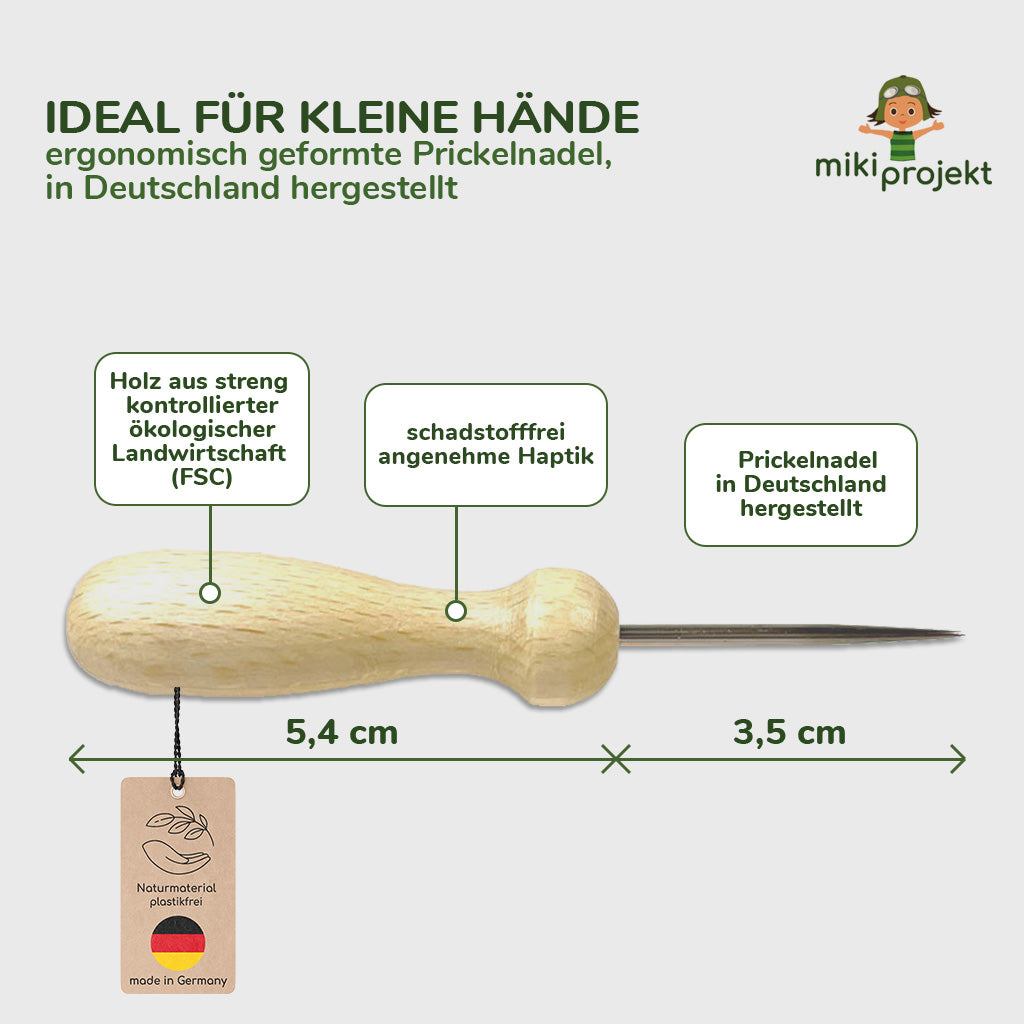 Das aus 10 hochwertigen Prickelnadeln und 10 Filzunterlagen bestehende Prickelset fördert nicht nur die Kreativität, sondern auch die Feinmotorik und Konzentration.