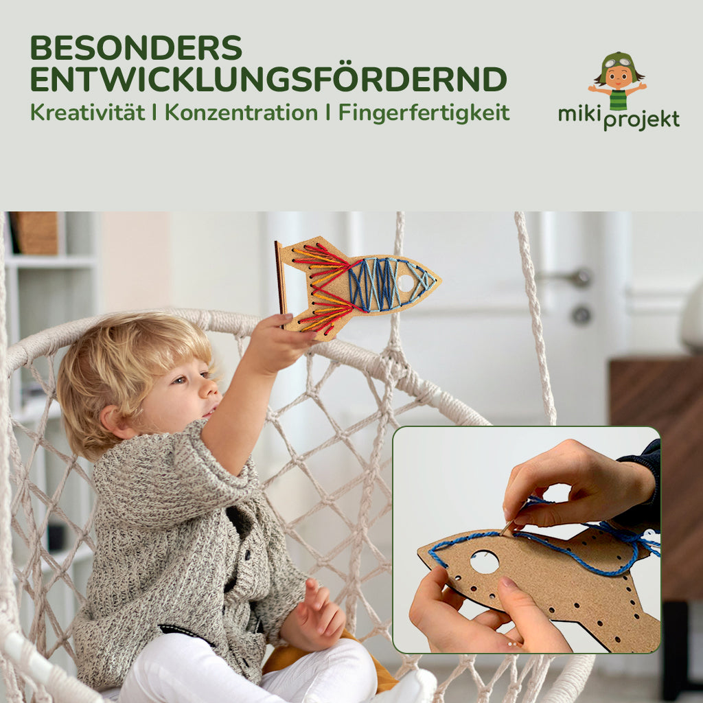 Diese 18 cm große Rakete aus Holz (MDF) wird mit flauschiger Wolle bestickt.