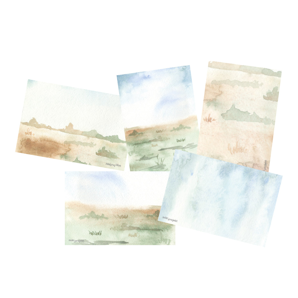 5 hochwertige Designkarten ca. 10 x 15 cm aus dickem Karton. Die Rückseiten sind in sanften Tönen bedruckt und können beschrieben werden.