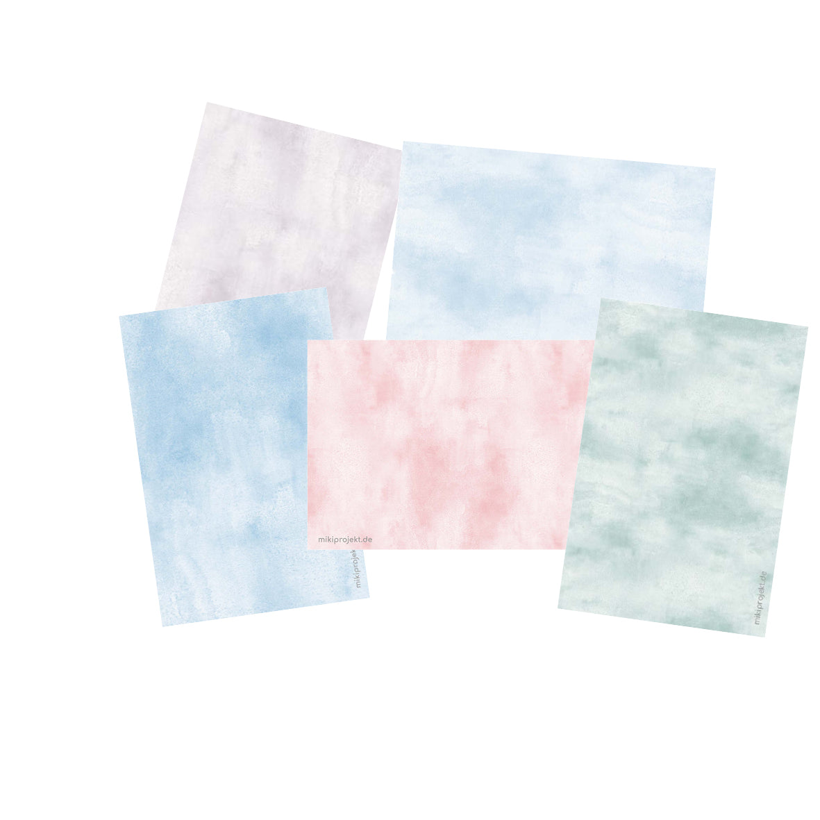5 hochwertige Designkarten ca. 10 x 15 cm aus dickem Karton. Die Rückseiten sind in sanften Tönen bedruckt und können beschrieben werden.